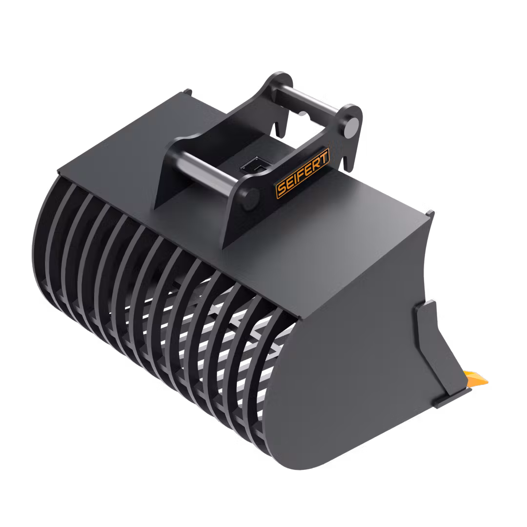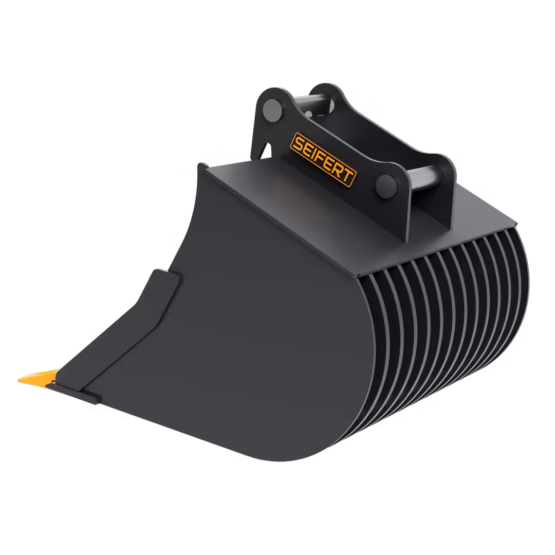 Der Sieblöffel eignet sich ideal für diverse Sortier- und Ladearbeiten. Mit einem Gitterabstand von 43mm kann diverses Gestein und andere Baustoffe ausgesiebt werden.