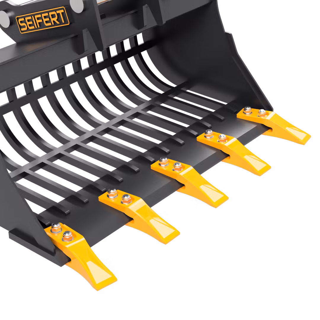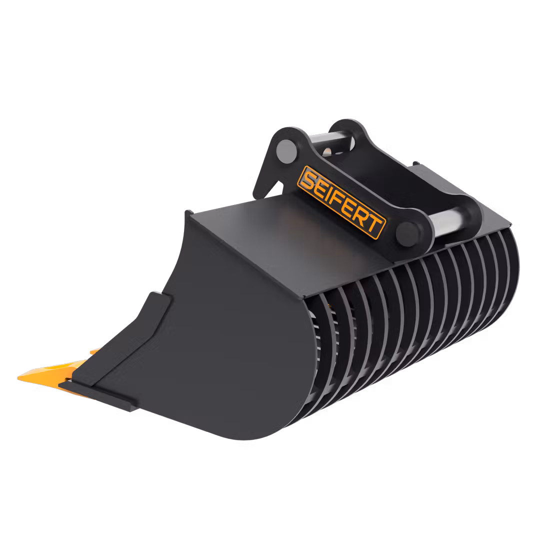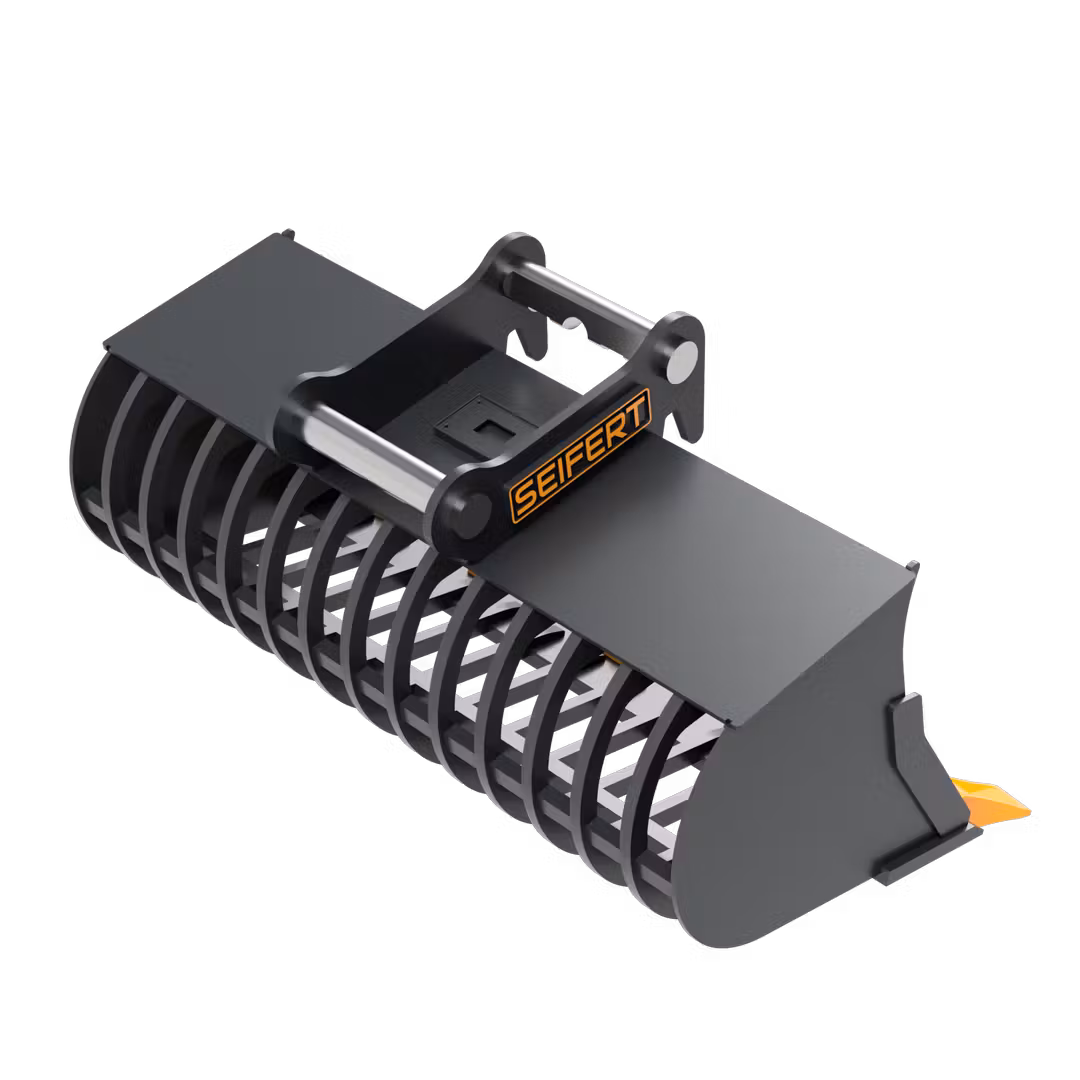 Der Sieblöffel eignet sich ideal für diverse Sortier- und Ladearbeiten. Mit einem Gitterabstand von 44mm kann diverses Gestein und andere Baustoffe ausgesiebt werden.